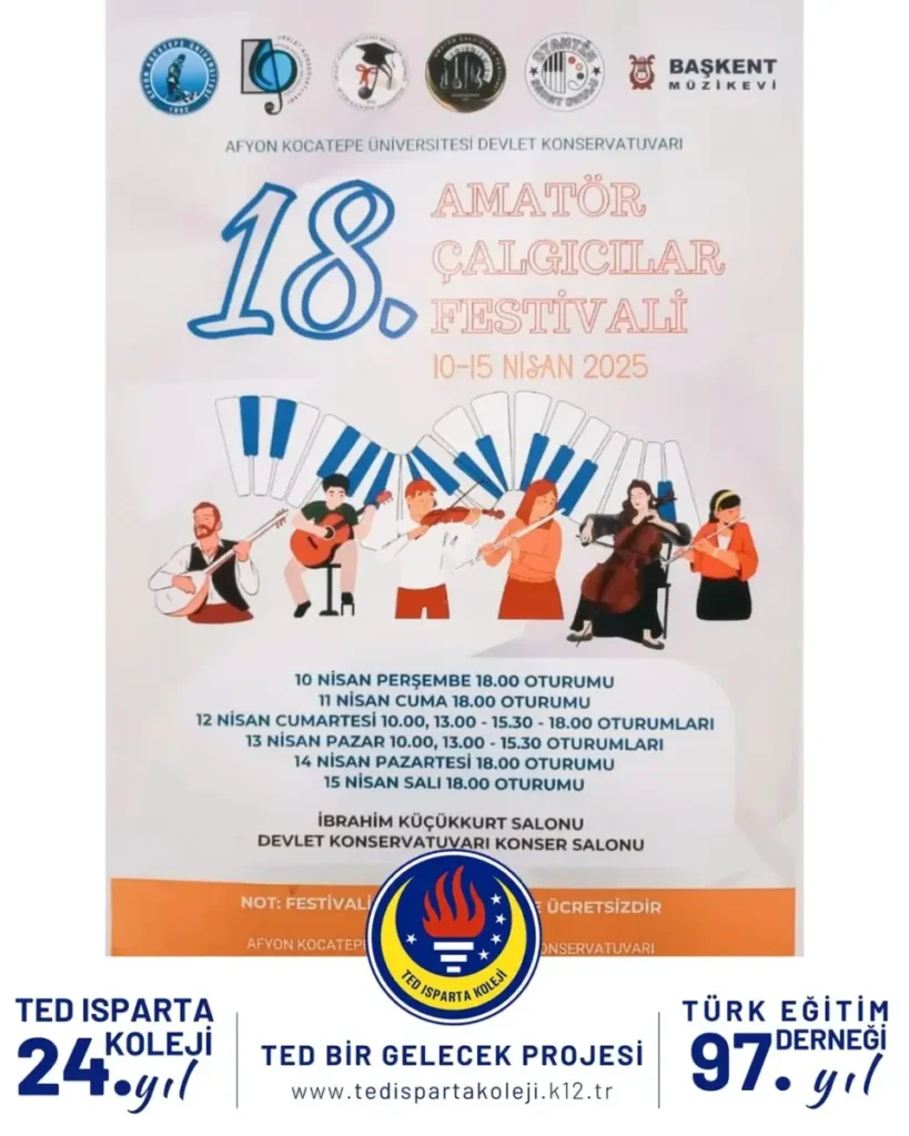 TED Isparta Koleji 10-C Bilim Sınıfı öğrencimiz Altay Küçükeşmen, 10-15 Nisan 2025 tarihleri arasında Afyon Kocatepe Üniversitesi Devlet Konservatuvarı tarafından düzenlenen *18. Amatör Çalgıcılar Festivali*ne katılarak okulumuza onur yaşattı.