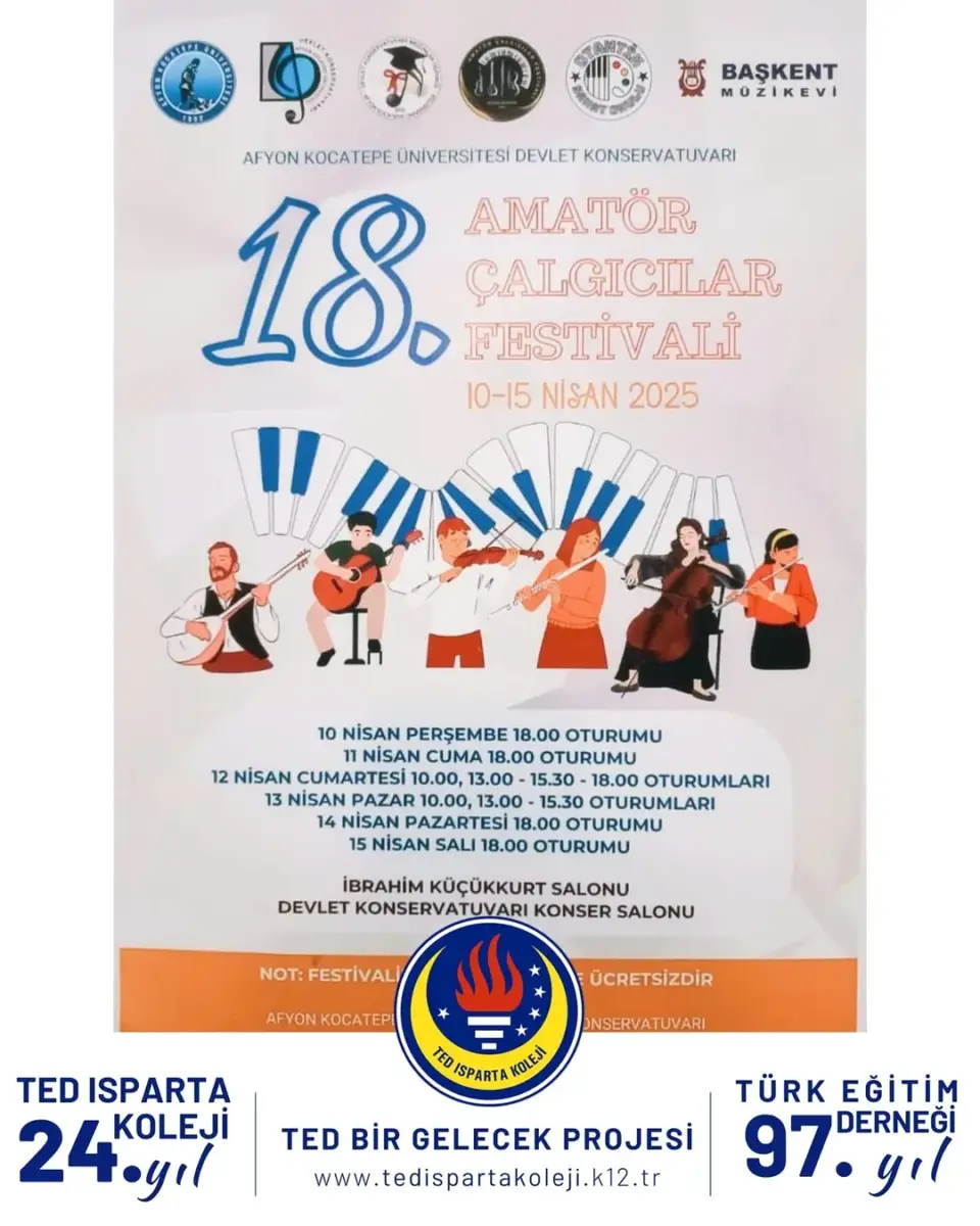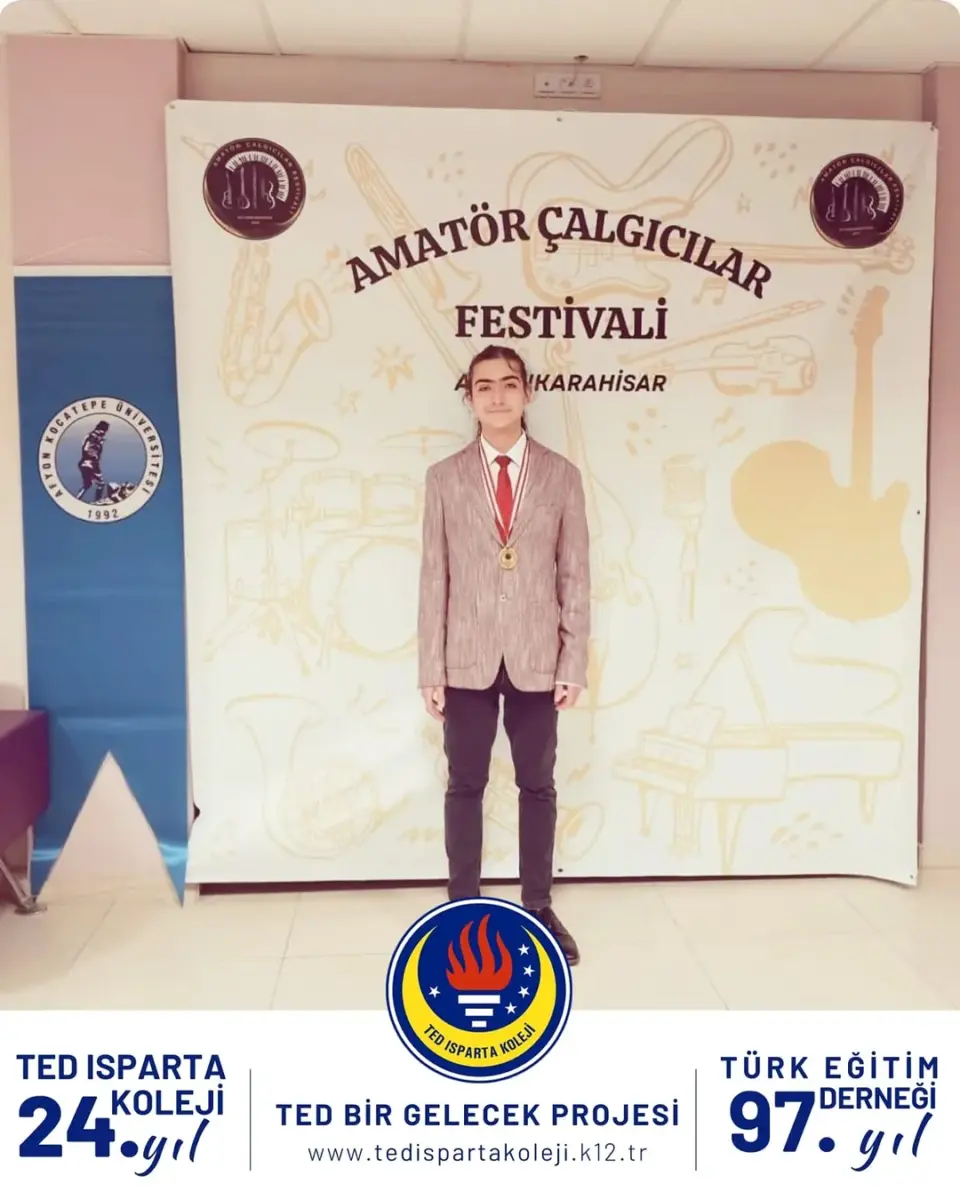 TED Isparta Koleji 10-C Bilim Sınıfı öğrencimiz Altay Küçükeşmen, 10-15 Nisan 2025 tarihleri arasında Afyon Kocatepe Üniversitesi Devlet Konservatuvarı tarafından düzenlenen *18. Amatör Çalgıcılar Festivali*ne katılarak okulumuza onur yaşattı.