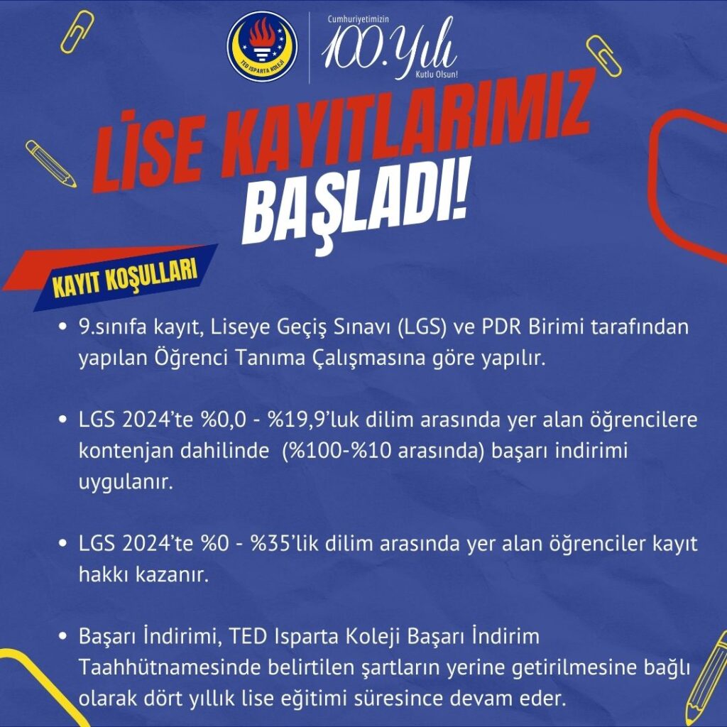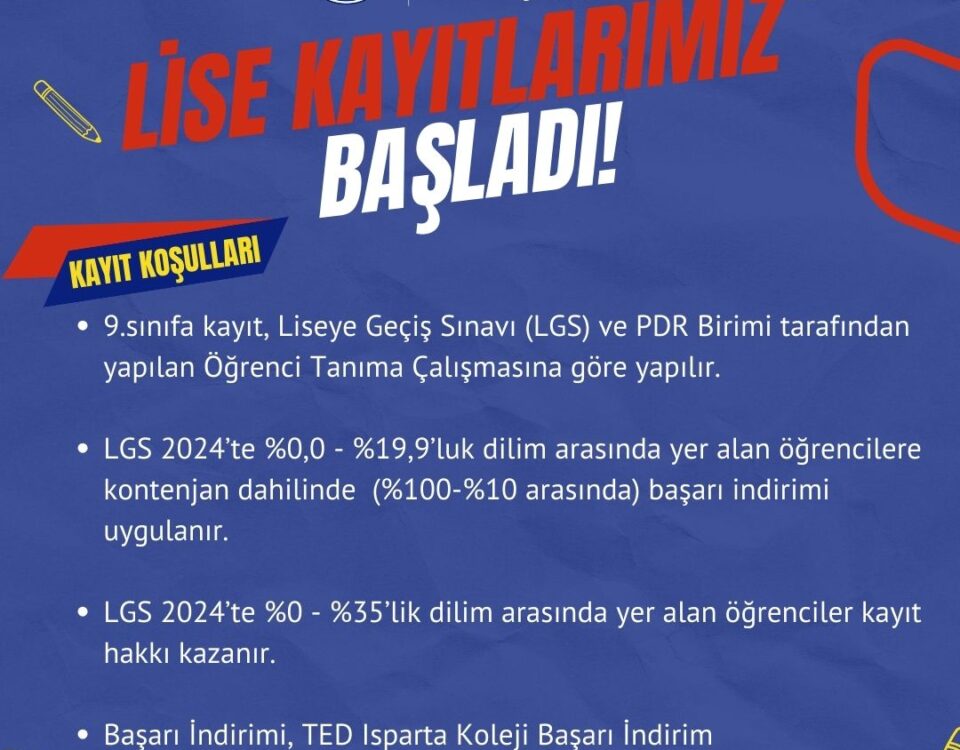 TED Isparta Koleji Anadolu Lisesi 2024-2025 Kayıt Koşulları -9.sınıfa Liseye Geçiş Sınavı (LGS) ve PDR birimi tarafından yapılan Öğrenci Tanıma Çalışmasına göre kayıt alınır. -LGS’de %0,0-%19,9’luk […]