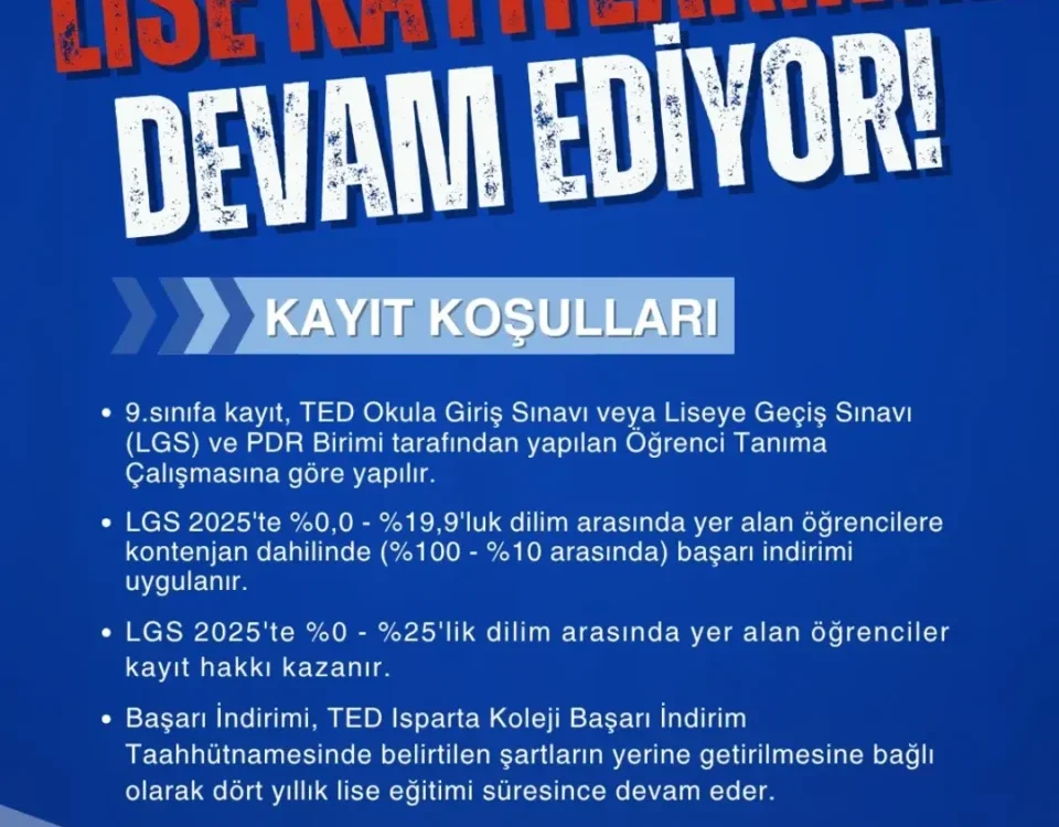 🎓 TED Isparta Koleji’nde LİSE KAYITLARIMIZ DEVAM EDİYOR! Geleceğe sağlam adımlarla ilerlemek isteyen 9. sınıf öğrencilerini bekliyoruz! 🌟 📌 Kayıtlar, TED Okula Giriş Sınavı veya LGS […]