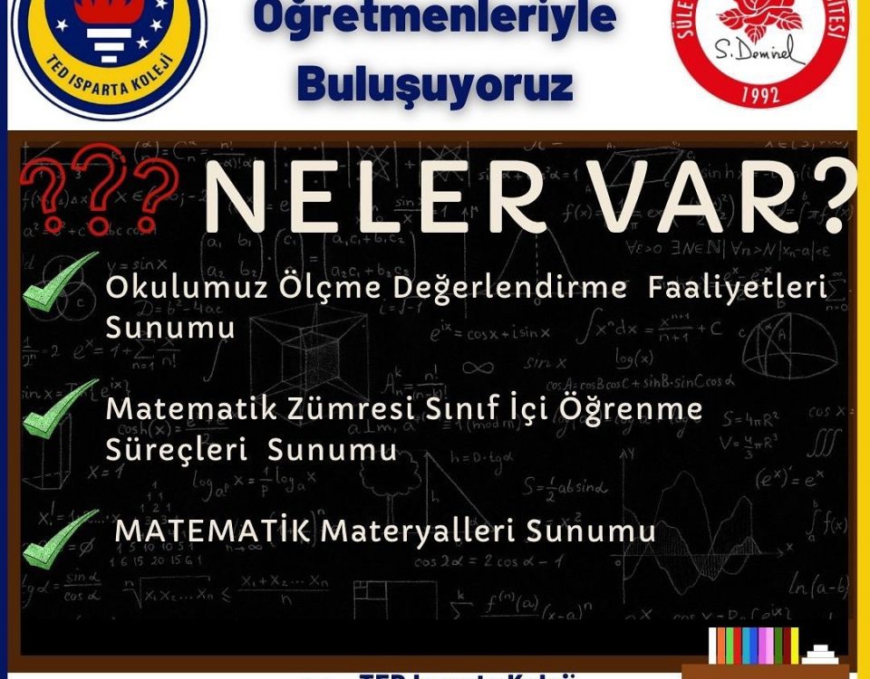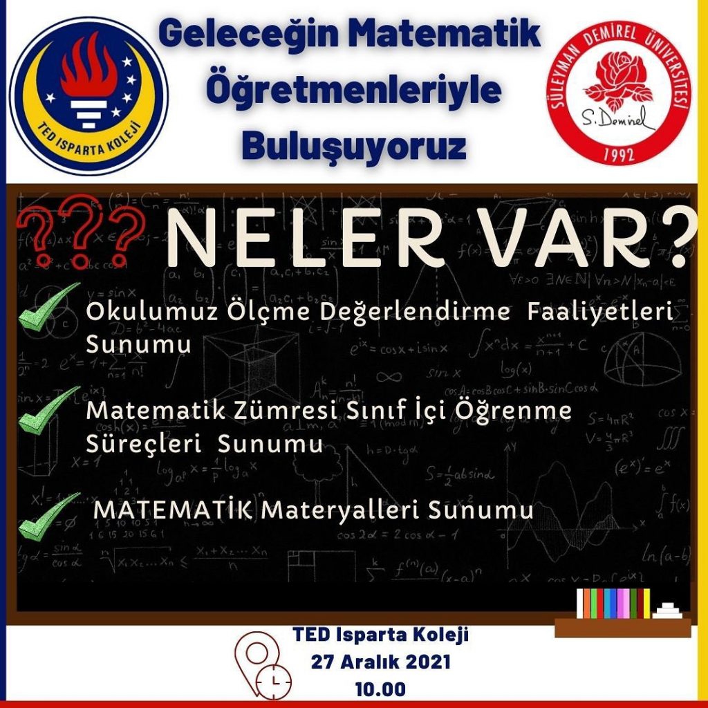 SDÜ Matematik ve Fen Bilimleri Eğitim Bölümü İlköğretim Matematik Öğretmenliği 3.sınıf öğrencilerine okulumuzdaki Matematik Dersi Uygulamaları ve Ölçme Değerlendirme Çalışmaları hakkında sunumlar yapacağız.