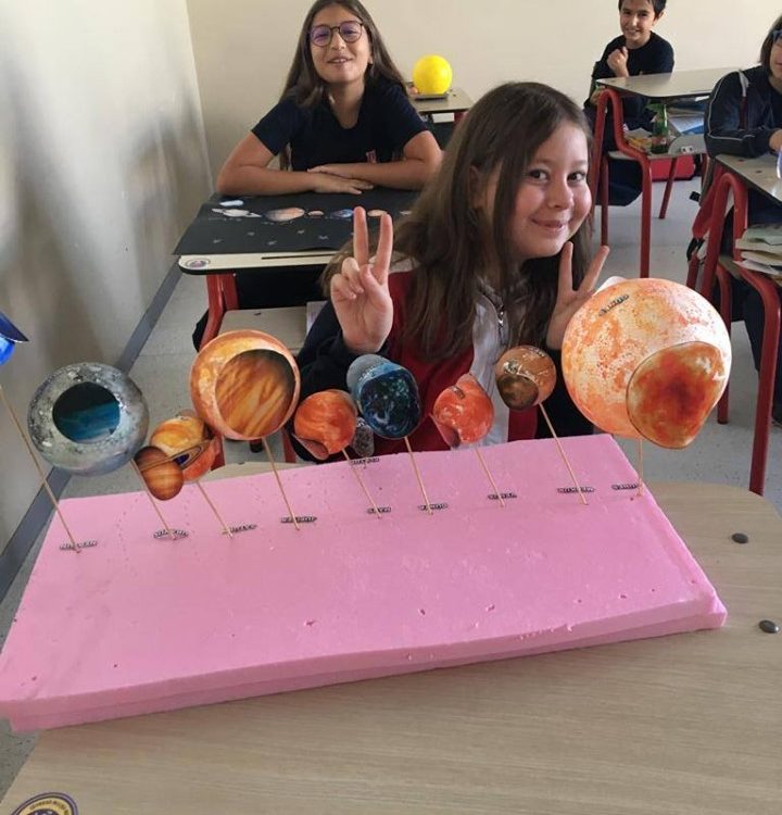 Okulumuz 6A/B sınıfı öğrencileri Fen Bilimleri Öğretmeni Çiğdem Kurnaz eşliğinde kendilerinin hazırladıkları Güneş Sistemi görsellerini sınıfta anlatarak konuyu daha kalıcı bir şekilde kavradılar