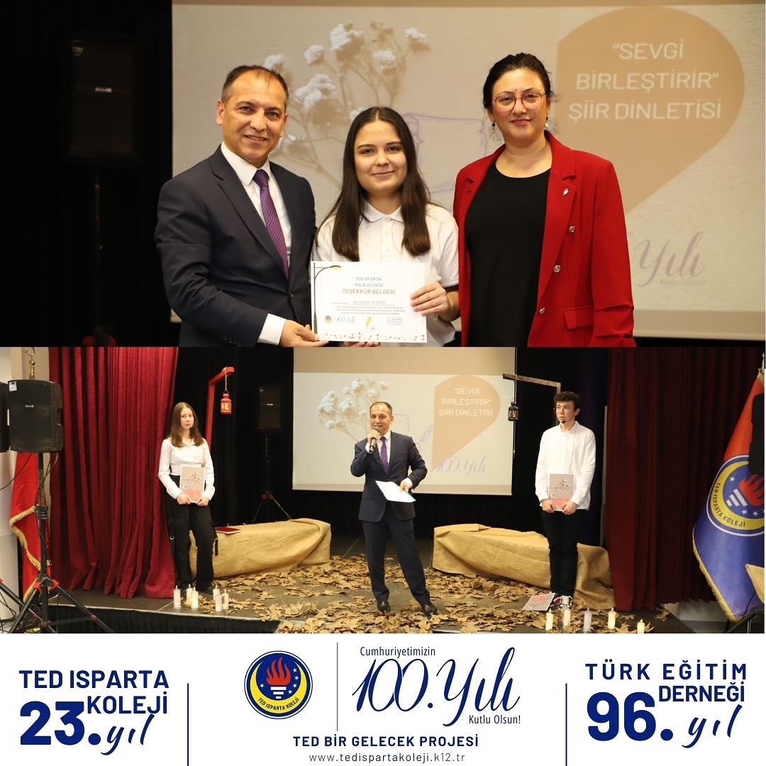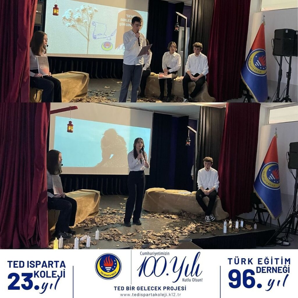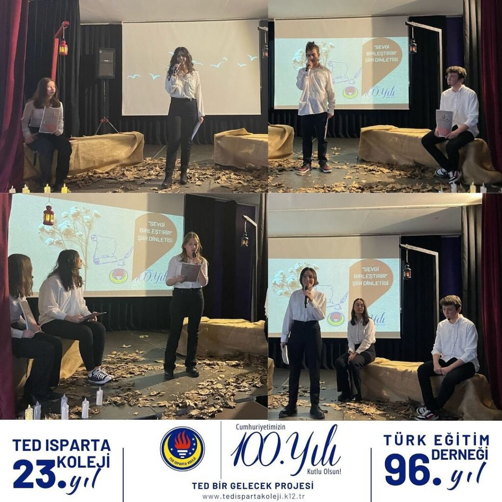 TED Isparta Koleji Lisesi öğretmen ve öğrencileri “Sevgi Birleştirir” temalı şiir dinletisinde muhteşem bir şiir şöleni gerçekleştirdi. Mehlika Sultan’a aşık 7 gençle başlayan dinletimiz palamut sevgisi, baba sevgisi, anne sevgisi, sevgiliye olan sevgi, dost sevgisi , insan sevgisi ve vatan sevgisi temaları üzerine edebiyatımızın seçkin örneklerini seslendiren öğrencilerimiz yorumlarıyla dinleyicileri şiirle buluşturdu. Müzik, drama ve filmlerle zenginleştirdiğimiz şiir dinletimize katılarak bizleri onurlandıran Isparta Milli Eğitim Müdürümüz Sayın Erhan Baydur’un da Nurullah Genç’in “Can Kuşum” isimli şiirini yorumlamasıyla programımız sona erdi.